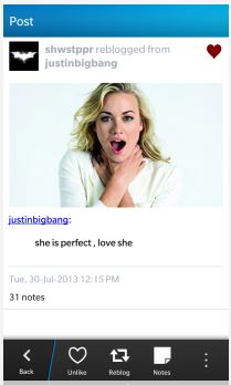 So, what can you do with Bee? Pretty much everything else! You can post, reblog, edit existing posts, like (or love), unlike items and even perform a search based on tags. Basically, the way you use the platform has still been preserved and that’s what you’re getting with Bee. Whether you like to repost existing content or create your own, you can do just that and all from your Blackberry 10 device. It seems nearly perfect for the beautiful display on Blackberry 10 devices too, especially the Z10. I love swiping through the Tumblr feed, browsing lots of art, graphics and more.