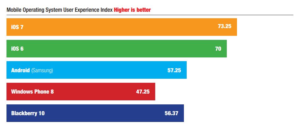 Even though Blackberry 10 is lower on the list, you can see it just missed beating Android by about a point. That means, even though iOS reigns supreme Blackberry and Android are pretty close to a tie in terms of user experience. It makes a lot of sense though when you think about it, as the two platforms are remarkably similar. Android has had a lot longer development time, which translates to more features and a more streamlined experience.